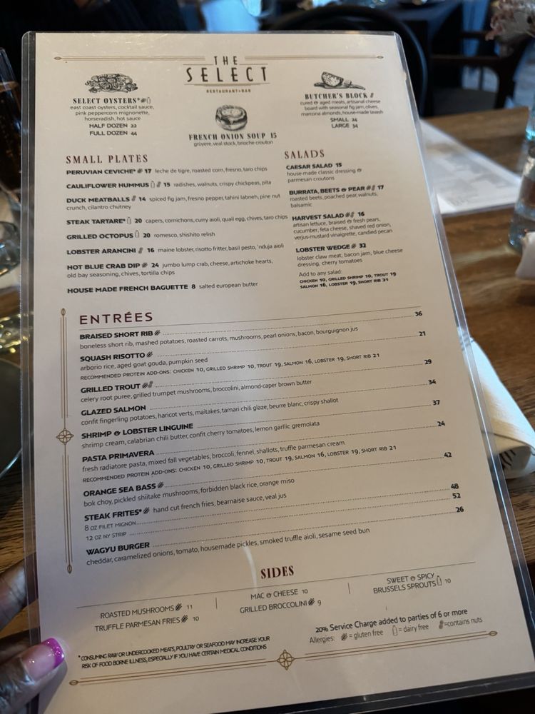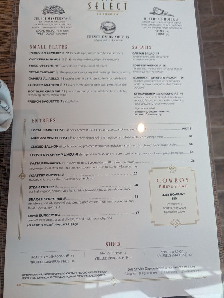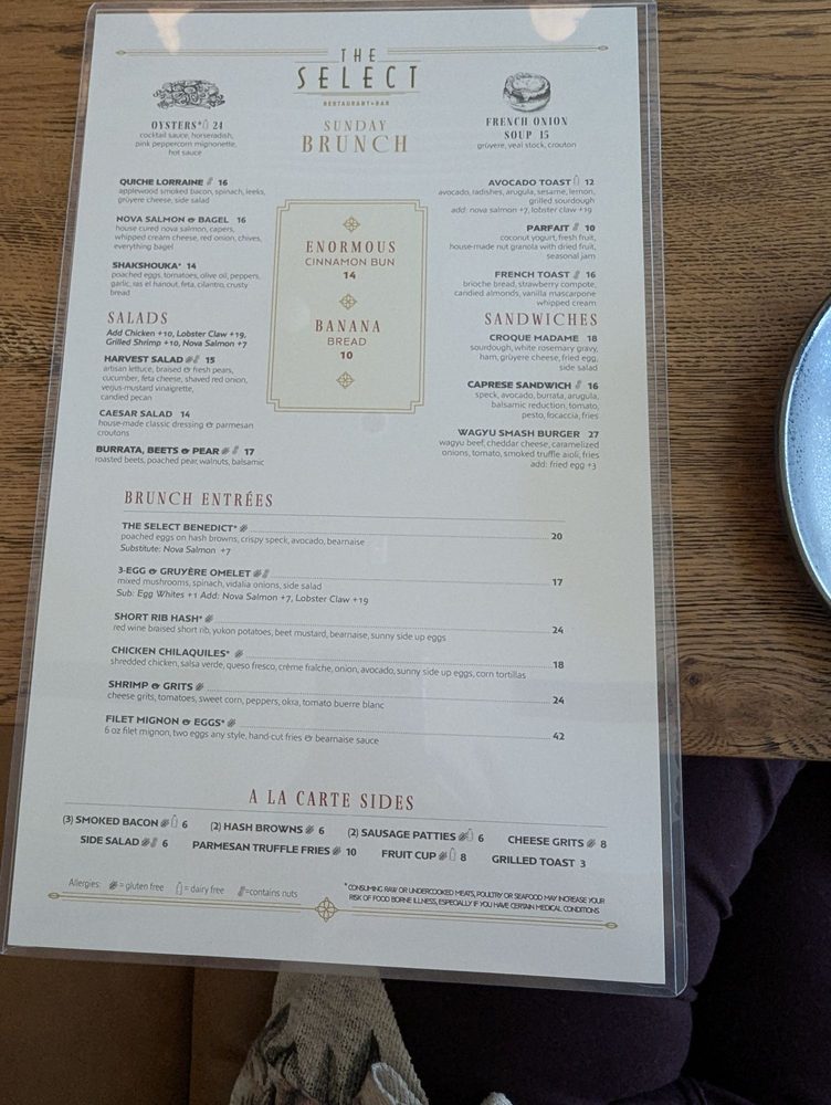 With options for takeout, delivery, and outdoor seating, **The Select** caters to every need. Specialties like the homemade baguette served with salted European butter add a unique touch. Indulge in their happy hour specials or savor a peach mimosa as you unwind in this welcoming atmosphere.